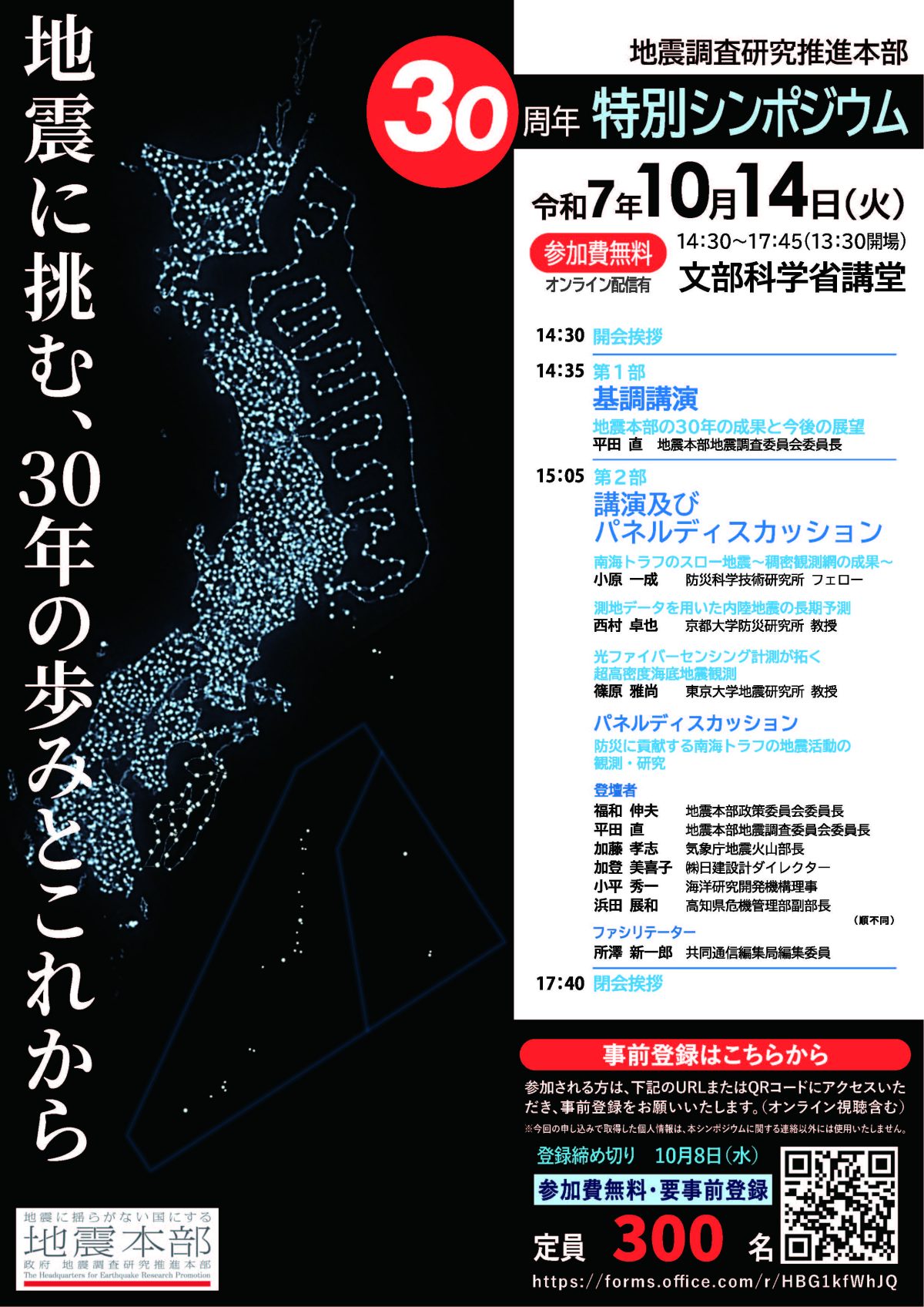 【情報提供】 地震調査研究推進本部30周年特別シンポジウム「地震に挑む、30年の歩みとこれから」開催のお知らせ