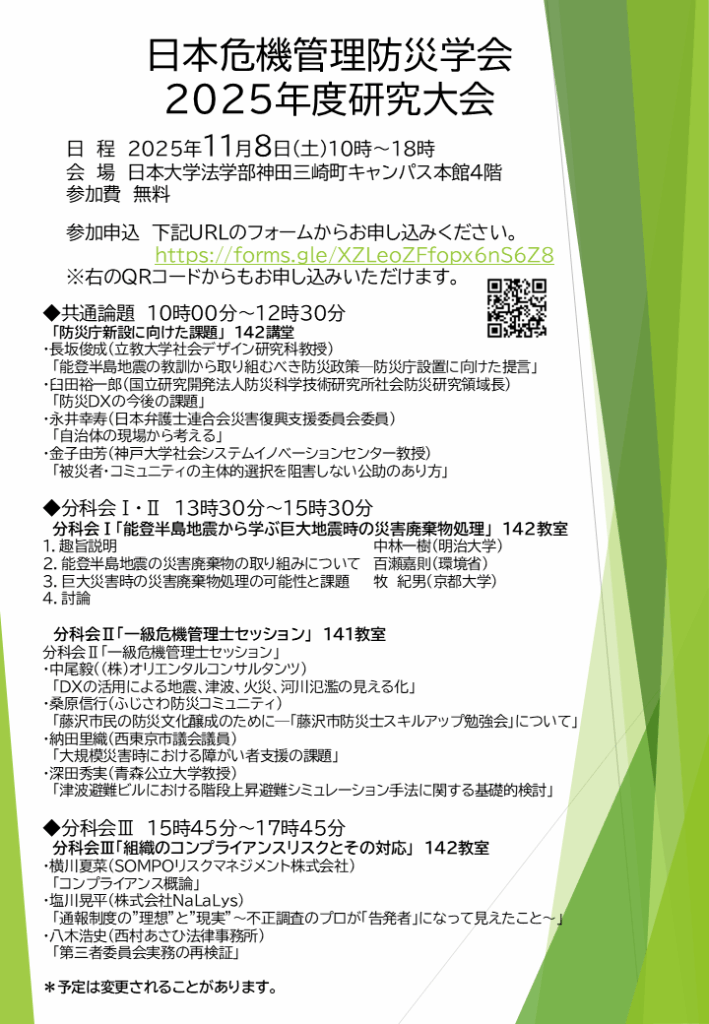 さて、「2025年度(第19回)研究大会」につきまして、下記のとおり日本大学法学部神田三崎町キャンパスにて開催いたします。